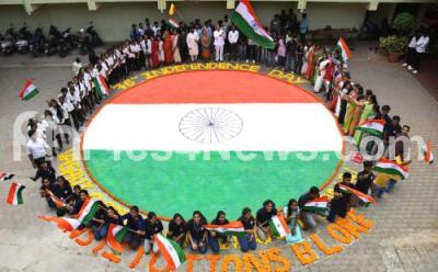 Photo Caption : 80 Students and 30 faculties drawing 1500 sq ft Indian National flag by using 60kg rangoli, 30kg flowers to bring in patriotism ahead of 76th Independence Day celebration, in Bengaluru on Monday 14th August 2023