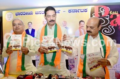 BJP State President Nalin Kumar Kateel and Former CM Basavaraj Bommai releasing Karnataka State Congress government 100 days mismanagement administrations list book during a press conference at a private hotel, in Bengaluru on Tuesday 29th August 2023