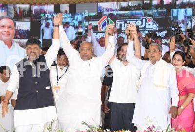 Photo Caption : AICC President Mallikarjun Kharge with Congress leader Rahul Gandhi, Chief Minister of Karnataka Siddaramaiah, DCM DK Shivakumar, Minister Lakshmi Hebbalkar and others during the launch of "Gruha Lakshmi" Congress government guarantee scheme, in Mysuru on Wednesday 30th August 2023