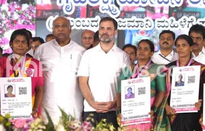 Photo Caption : AICC President Mallikarjun Kharge with Congress leader Rahul Gandhi, Chief Minister of Karnataka Siddaramaiah, DCM DK Shivakumar, Minister Lakshmi Hebbalkar and others during the launch of "Gruha Lakshmi" Congress government guarantee scheme, in Mysuru on Wednesday 30th August 2023