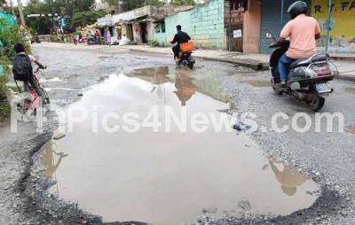 Photo Caption : Pothole road at Railway gate in KR Puram constituency and has been causing major inconvenience to people and motorists, in Bengaluru on Tuesday 5th September 2023