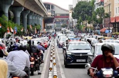 Photo Caption : Traffic jam on MG Road due to youth congress and Congress committee celebration to mark 1st anniversary of Bharath Jodo Yatra, in Bengaluru on Thursday 7th September 2023