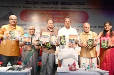 Photo Caption : CM Siddaramaiah releasing the books titled "Belaku Bittidavaru" and "The Journey of Life" at Gandhi Bhavan, also seen are Nadoja Baraguru Ramchandrappa, Nadoja Kamala Hamapana, Hampa Nagararajaiah and others , in Bengaluru on Friday 8th September 2023