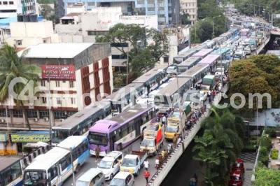 Photo Caption : Traffic jam on Sangolli Rayanna fly over, following Karnataka Private transport unions and other transport associations called Bengaluru Bandh demanding the withdrawal of the Congress governments Shakti Yojana (Scheme), in Bengaluru on Monday 11th September 2023