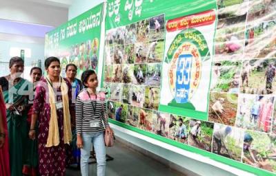 Photo Caption : Visitors looking at the photo exhibition during Laksha Vruksha Neduva Abiyana (Lakh Tree Plantation Campaign) organised by Aranya Bhoomi Hakku Horatagarara Vedike (Forum of Forest Land Rights Activists) at Jnana Jyothi Auditorium, in Bengaluru on Thursday 14th September 2023