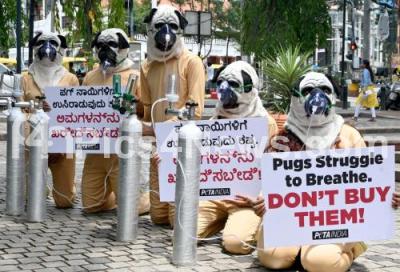Event Description : Supporters of People for the Ethical Treatment of Animals(PETA) wears Pug dog costumes and oxygen masks to warn citizens not to buy foreign brachycephalic dogs, as pugs struggle to breathe and require surgery for serious respiratory problems, in Bengaluru on Thursday 14th September 2023