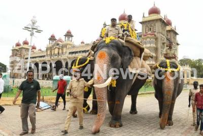 Photo Caption : Dasara elephants Jumbo savari rehearsal ahead of Dasara 2023 festival celebrations at Mysore Palace, in Mysuru on Friday 15th September 2023