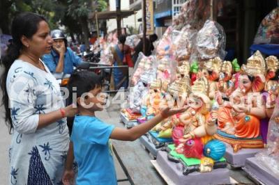 Event Description : Ganesha Idols on sale at RV Road ahead of Ganesh Chaturthi festival, in Bengaluru on Friday 15th September 2023