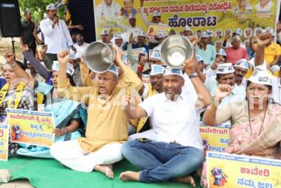 Photo Caption : Members of Aam Aadmi Party led by State president Mukhyamantri Chandru with party leaders protest against the state government for leaving Cauvery water to Tamil Nadu at Freedom Park, in Bengaluru on Wednesday 20th September 2023