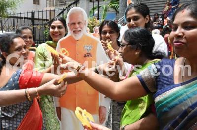 Event Description : Karnataka BJP Mahila Morcha members distributing sweets and celebrating in front BJP office, after the introduction of the Women Reservation Bill in parliament , in Bengaluru on Wednesday 20th September 2023