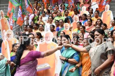 Photo Caption : Karnataka BJP Mahila Morcha members distributing sweets and celebrating in front BJP office, after the introduction of the Women Reservation Bill in parliament , in Bengaluru on Wednesday 20th September 2023
