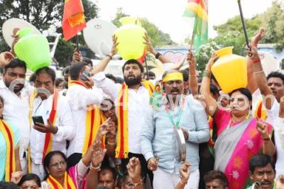 Photo Caption : Members of Jaya Karnataka Janapara Vedike protesting against release of Cauvery river water to Tamil Nadu state, in Bengaluru on Tuesday 26th September 2023