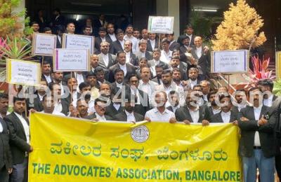 Photo Caption : Members of The Advocates Association, Bengaluru protesting against release of Cauvery river water to Tamil Nadu state, in Bengaluru on Tuesday 26th September 2023