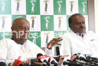 Photo Caption : Former PM and JD(S) Supremo HD Devegowda and Former CM and JD(S) leader HD Kumaraswamy during a press conference at JP Bhavan, in Bengaluru on Wednesday 27th September 2023