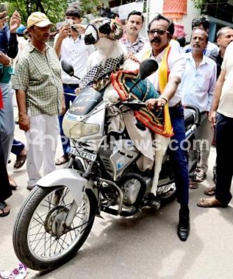 Photo Caption : A man with a goat on his bike during Pro Kannada Activists protest rally to protest against release of Cauvery river water to Tamil Nadu state, in Bengaluru on Friday 29th September 2023