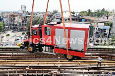 Photo Caption : Emergency recovery road rail vehicle which broke down on Namma Metro track on green line, is being removed by using hydraulic crane at Rajajinagar Metro Station, in Bengaluru on Tuesday 3rd October 2023