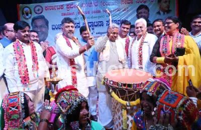 Photo Caption : Chief Minister of Karnataka Siddaramaiah with DCM DK Shivakumar and Banjara Community women during the inauguration of Banjara Bhavan at Vasanthnagar, in Bengaluru on Wednesday 4th October 2023