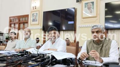 Photo Caption : DCM DK Shivakumar addressing press conference regarding Tunnel Road Project in the Bengaluru City, the meeting was held at Vidhana Soudha, also seen are Project Commission Vice President, Rajeev Gowda, Additional Chief Secretary, Water Resources Department, Rakesh Singh and others , in Bengaluru on Thursday 5th October 2023