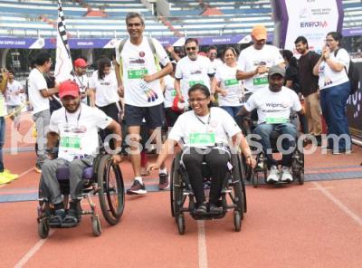 Photo Caption : Disabled participants run with the aid of Assistive Technology during a WIPRO Bengaluru marathon at Kanteerava Stadium, in Bengaluru on Saturday 7th October 2023