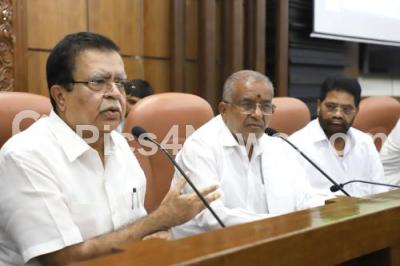 Photo Caption : KN Rajanna, Minister for Cooperation with GT Devegowda, President of Karnataka Co-Operative Federation and others during a review meeting on 70th Akila Bharata Sahakara Sapthaa (All India Cooperation Week) at Vikasa Soudha, in Bengaluru on Monday 9th October 2023