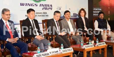Dr. CM Anand, Program Director for Civil Aircrafts with Remi Maillard, Chairman, FICCI Civil Aviation Committee, Gaurav Gupta, IAS, Additional Chief Secretary, GoK, Vumlunmang Vualnam, IAS, Secretary, Ministry of Civil Aviation, GoI, Asangba Chuba Ao, IAS, Joint Secretary, Ministry of Civil Aviation, GoI, Dr. DK Sunil, Director Engineering and R and D, HAL and Hari Marar, MD and CEO, BIAL during a road show to promote "Wings India 2024" at a private hotel, in Bengaluru on Thursday 12th October 2023