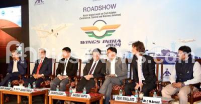 Photo Caption : Dr. CM Anand, Program Director for Civil Aircrafts with Remi Maillard, Chairman, FICCI Civil Aviation Committee, Gaurav Gupta, IAS, Additional Chief Secretary, GoK, Vumlunmang Vualnam, IAS, Secretary, Ministry of Civil Aviation, GoI, Asangba Chuba Ao, IAS, Joint Secretary, Ministry of Civil Aviation, GoI, Dr. DK Sunil, Director Engineering and R and D, HAL and Hari Marar, MD and CEO, BIAL during a road show to promote "Wings India 2024" at a private hotel, in Bengaluru on Thursday 12th October 2023