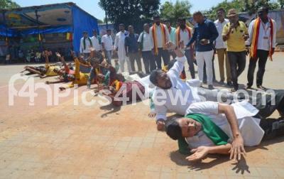 Event Description : Kannada Activists Kurubara Shantha Kumar along with others members protesting by rolling on the ground against the state government for releasing water to Tamil Nadu, in Bengaluru on Friday 13th October 2023