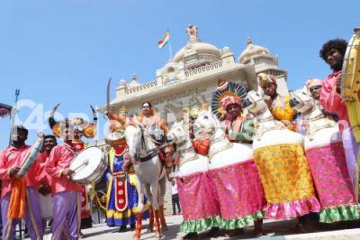 Photo Caption : Folk artistes seen during the "Kittur Utsav 2023" in front of Vidhana Soudha, in Bengaluru on Friday 13th October 2023