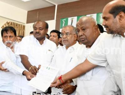 Former CM and JD (S) leader HD Kumarswamy selected as a JD(S) State President during JD(S) core committee meeting, also seen are JD(S) Supremo HD Devegowda and JD(s) leaders, in Bengaluru on Thursday 19th October 2023