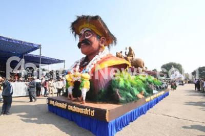 Photo Caption : Tableaux on display during the Jamboo Savari procession, as part of Dasara Festival 2023 celebrations, in Mysuru on Tuesday 24th October 2023