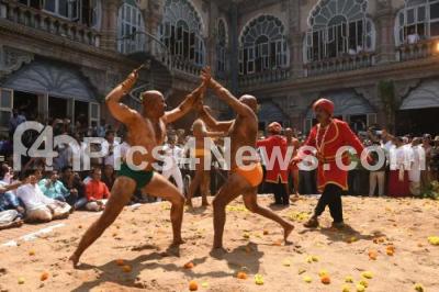 Wrestlers participate in the “Vajramushti Kalaga”(Wrestling), as part of Dasara Festival 2023 celebrations and Vijayadashami celebrations at Mysuru Palace, in Mysuru on Tuesday 24th October 2023