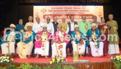 Event Description : Shree Kala Jyothi awarded artistes with Sri Yadugiri Yathiraja Narayana Ramanuja Jeeyer, Vid Dr. Vidyabhushana, Vid. HK Narasimha Murthy and others during the valedictory function of 53rd Music Conference at Gayana Samaj , in Bengaluru on Sunday 5th November 2023