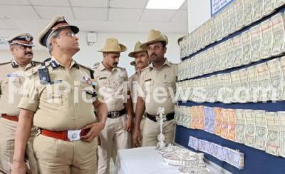 Photo Caption : Bengaluru City Police Commissioner, B Dayanada, inspects the seized cash and silver items during a property parade at Police commissioner office, in Bengaluru on Tuesday 7th November 2023