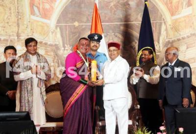 Photo Caption : Governor of Karnataka Thaawarchand Gehlot presenting Champions of Change Karnataka award to Manjamma Jogathi, Theatre actress and singer during the "Champions of Change Karnataka Awards" ceremony organized by the Interactive Forum on Indian Economy , in Bengaluru on Tuesday 7th November 2023