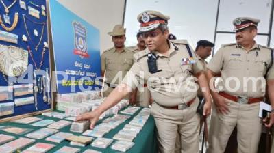 Photo Caption : Bengaluru City Police Commissioner B Dayananda inspecting the seized cash and jewels during a property parade press conference at Bengaluru City Police Commissioners Office, in Bengaluru on Friday 17th November 2023