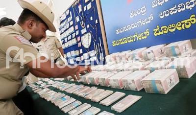 Photo Caption : Police personnel arrange the seized cash and jewels during a property parade press conference at Bengaluru City Police Commissioners Office, in Bengaluru on Friday 17th November 2023
