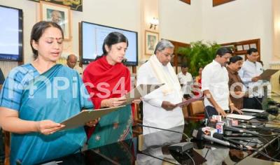 Photo Caption : Chief Minister Siddaramaiah administered the National Unity Oath to all officers and staff of the Ministry at Vidhana Soudha, on the occasion of the birth anniversary of former Prime Minister Indira Gandhi, also seen are Urban Development Department Minister Suresh (Byrathi), Chief Ministers Political Secretary Govindaraju, MLA Narendra Swamy, Chief Secretary to Government Vandita Sharma, Deputy Chief Secretary to Chief Minister Rajneesh Goyal, Deputy Chief Secretary and Development Commissioner Shalini Rajneesh and others, in Bengaluru on Sunday 19th November 2023