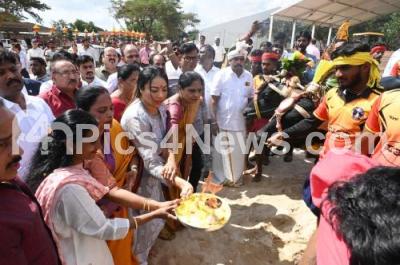 Bengaluru Kambala Namma Kambala committee members performing pooja for the "Bengaluru Kambala Namma Kambala" (buffalo race) during a trial run for Bengaluru Kambala Namma Kambala, which will be held on 25 to 26 November at Palace Grounds, in Bengaluru on Thursday 23rd November 2023