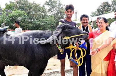 Photo Caption : Union Minister Shobha Karandlaje looking Kambala buffalo during the "Bengaluru Kambala Namma Kambala" (buffalo race), in Bengaluru on Friday 24th November 2023