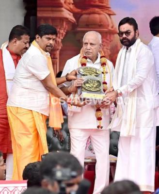 Photo Caption : Former Chief Minister BS Yediyurappa being felicitated during the "Bengaluru Kambala Namma Kambala" (buffalo race) at Palace Grounds, in Bengaluru on Saturday 25th November 2023