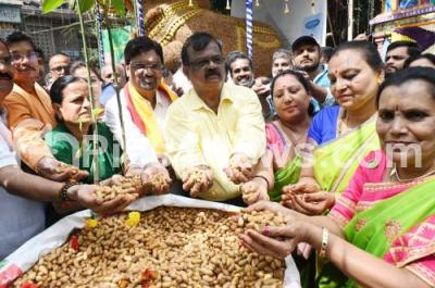 Photo Caption : BK Shivaram, President Kadumalleshwara Gelayara Balaga with Mahesh Joshi, President KASAPA and others during the Kadlekai Parishe (Groundnut mela) at Kadu Malleswaram temple, in Bengaluru on Saturday 2nd December 2023