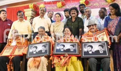 Photo Caption : Senior Actress Girija Lokesh with BB Ashok Kumar, Shabarimale Ayyappa Seva Samaja State President Dr. N Jayaram and Mohan Rao being honored with the Dr. Rajkumar Ratna award during "Karnataka 50" celebrations organised by Karnataka Rathna Dr. Puneeth Rajkumar Seva Samiti, also seen are Ashwini Puneeth Rajkumar, Retd. DGP Shankara Bidari, Retd. Police Officer BK Shivaram and others, in Bengaluru on Friday 15th December 2023