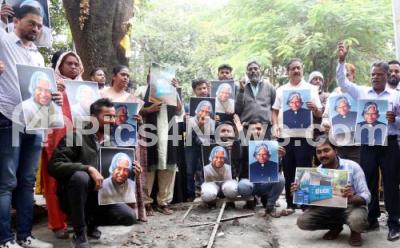 Photo Caption : Residents of Tilak Nagar, led by Former BBMP Councilor Nagaraj protesting against the demolition of Former President of India Abdul Kalam statue preparation work building, in Bengaluru on Sunday 17th December 2023