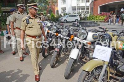 Photo Caption : Police commissioner Dayanand inspecting the seized bikes during the property parade of at Police commissioner office, in Bengaluru on Tuesday 19th December 2023
