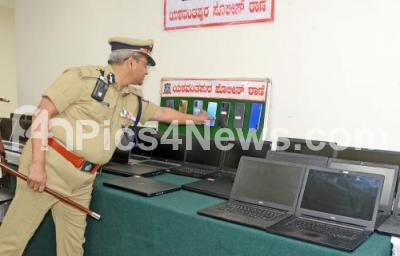 Photo Caption : Police commissioner Dayanand inspecting the seized smart phones and laptops during the property parade of at Police commissioners office, in Bengaluru on Tuesday 19th December 2023