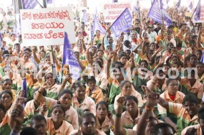 Members of state city, city council, municipality pourakarmika Workers Association protesting and demanding for direct wages and permanent employment, at Freedom Park, in Bengaluru on Friday 22nd December 2023