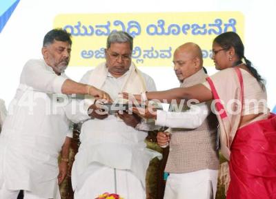 Event Description : Chief Minister Siddaramaiah inaugurated the registration process drive program of "Yuvanidhi" scheme for the bright future of the youth organized by the Department of Skill Development, Entrepreneurship and Livelihood at the Banquet Hall of Vidhana Soudha, also seen are Deputy Chief Minister DK Shivakumar and Minister Sharan Prakash Patil, in Bengaluru on Tuesday 26th December 2023