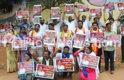 Photo Caption : Members of Karnataka Sangatanegala - Kannada Okkuta (Karnataka Organizations - Kannada Union) staged a protest against Minister Lakshmi Hebbalkar alleging her statements are anti Kannada at Freedom Park , in Bengaluru on Tuesday 9th January 2024