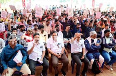 Photo Caption : Members of All India Democratic Youth Organisations Karnataka State Committee (AIDYO) with Former Lokayukta of Karnataka Justice N Santosh Hegde during a protest and demanding to fill the Central and State Vacancies at Freedom Park, in Bengaluru on Thursday 18th January 2024