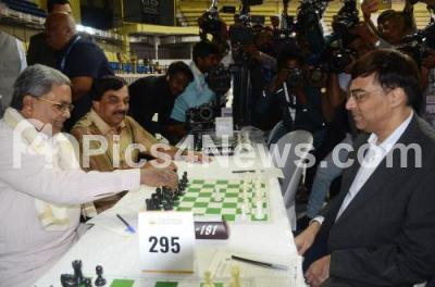 Photo Caption : Chief Minister of Karnataka Siddaramaiah with Viswanathan Anand, Indian Chess Grandmaster during the inauguration of "First Bangalore International Grandmaster Open Chess" organised by Bengaluru Urban District Chess Association at Kanteerava Indoor Stadium, in Bengaluru on Thursday 18th January 2024